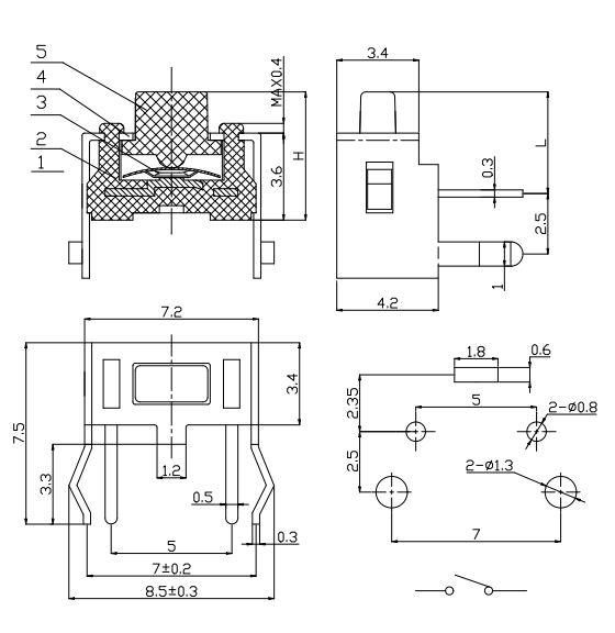 Mini interruptor tátil de 7,2 mm x 3,4 mm com suporte.